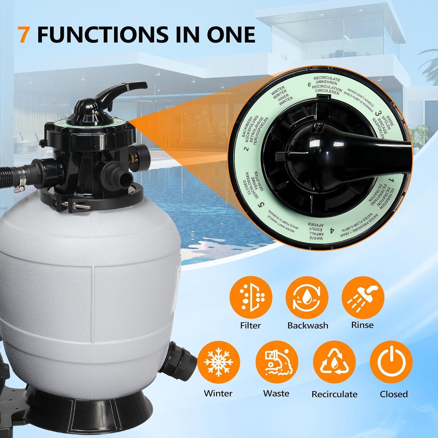 - 7 Function Controls: The multi-port valve offers Filter, Rinse, Backwash, Recirculate, Waste, Winter, and Closed settings for comprehensive pool management.